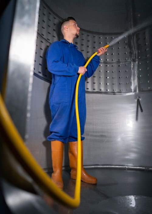 Onze medewerkers beschikken over VCA-attesten, dragen de juiste PBM’s en volgen opleiding in hoogtewerken en confined space cleaning. Zo garanderen we veiligheid voor mens, machine én milieu.